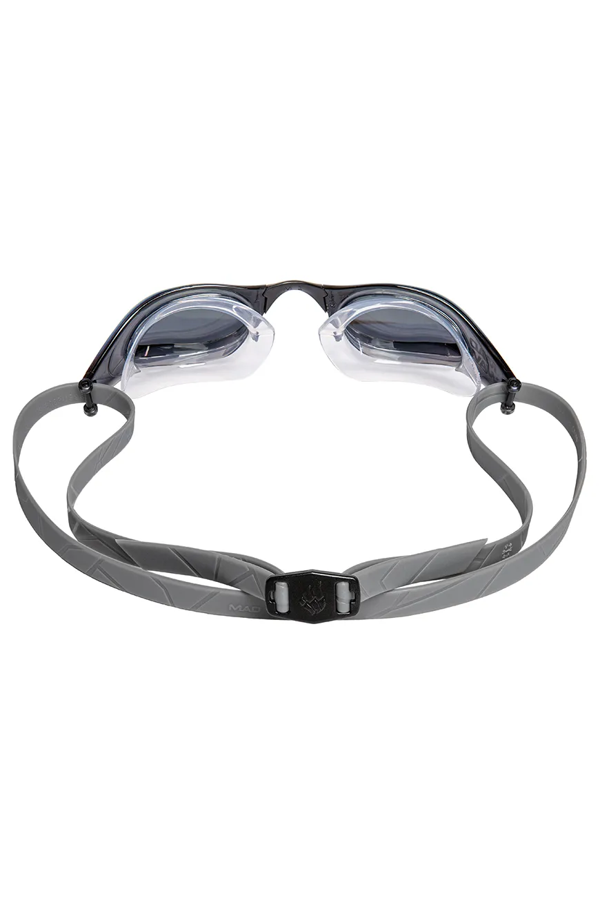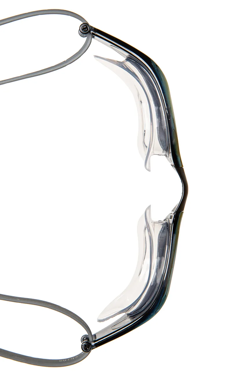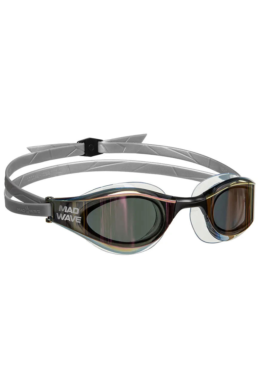 The goggles come with three interchangeable nose bridges for precise adjustment to individual facial features. The double silicone strap is easily adjustable with a special clip and keeps the goggles securely in place. Rainbow polycarbonate mirror lenses with UV protection protect the swimmer’s eyes from harmful ultraviolet rays. The anti-fog coating prevents condensation on the lenses.
